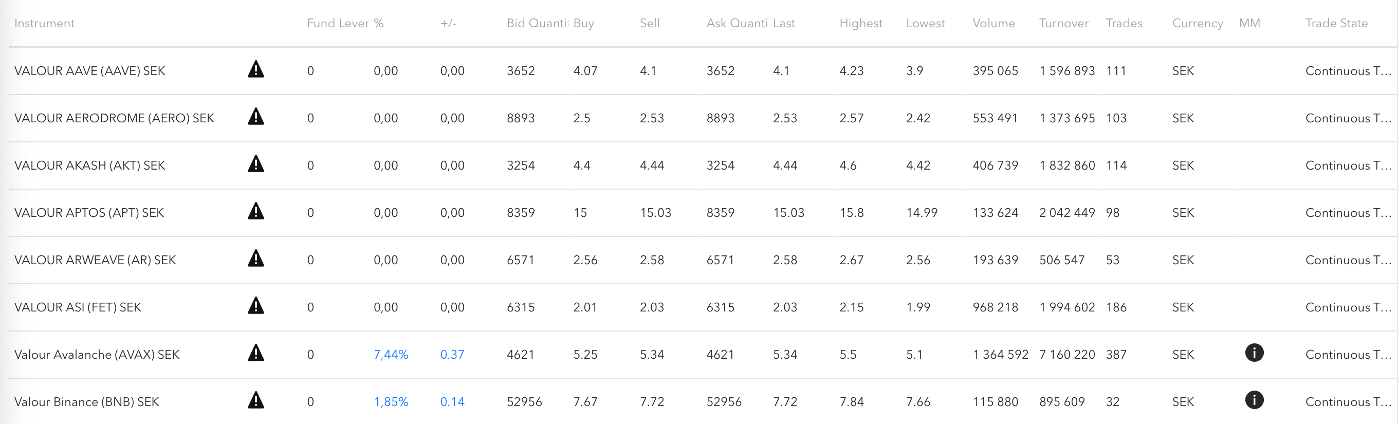 Eine Auswahl der Valour ETPs am Spotlight Stock Market. Quelle: Spotlight Stock Market