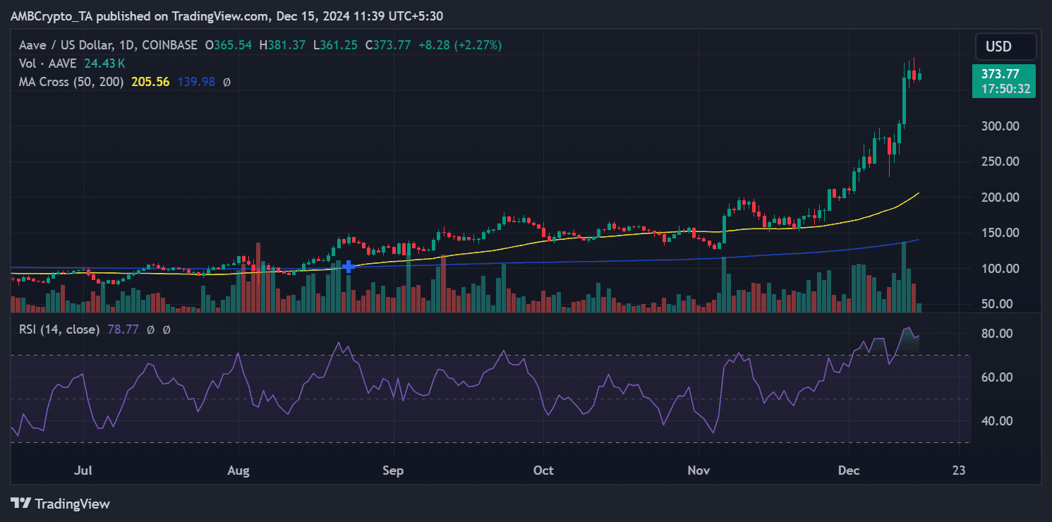 Der Preis von AAVE stimmt mit dem steigenden TVL überein. Der Token wird derzeit zu 373,77 $ gehandelt, was auf einen anhaltenden bullischen Trend hinweist.