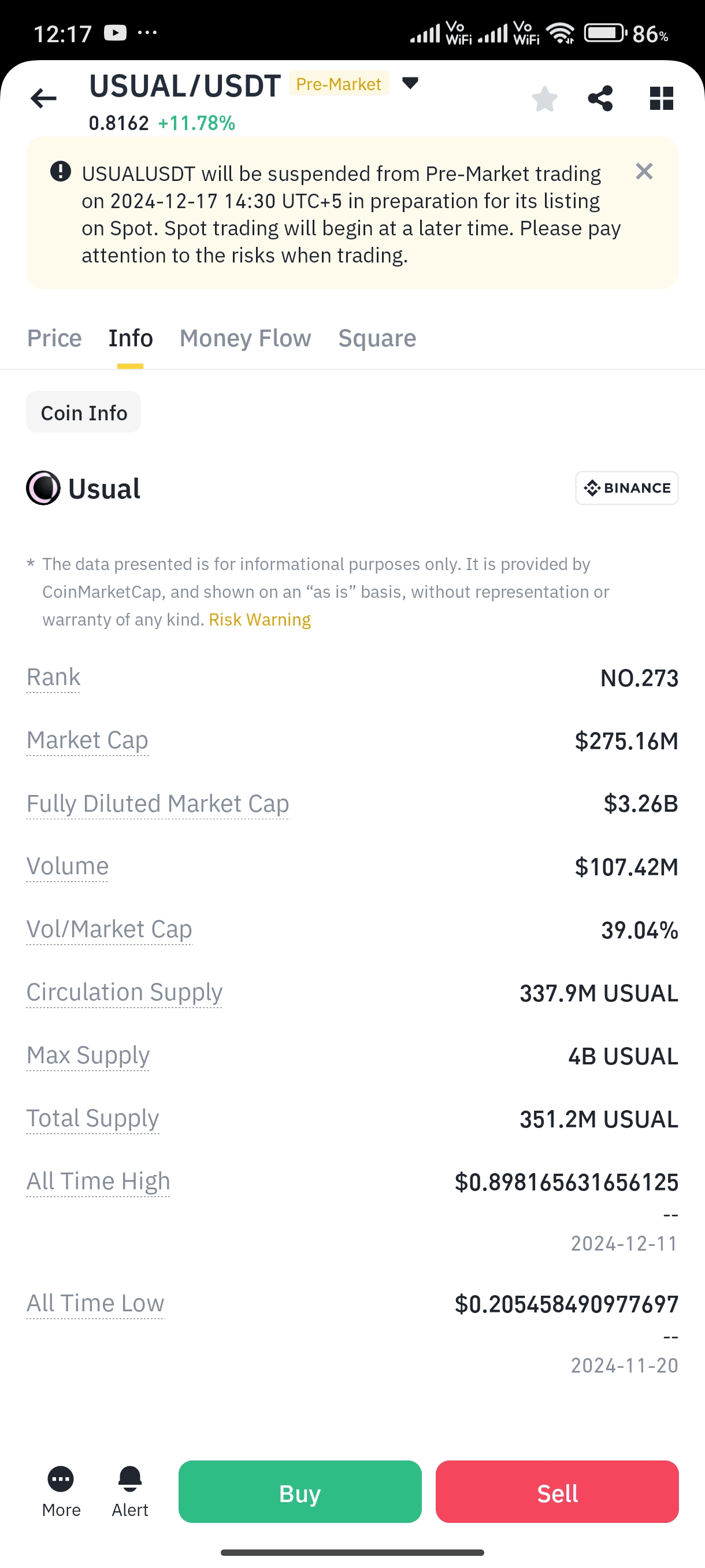 Wenn sich Hype aufbaut und Händler eine starke Nachfrage erwarten, könnte USUAL seinen Allzeithoch (ATH) von 0,8981 $ übertreffen und möglicherweise während der finalen Notierung 1,00 $ bis 1,20 $ erreichen.