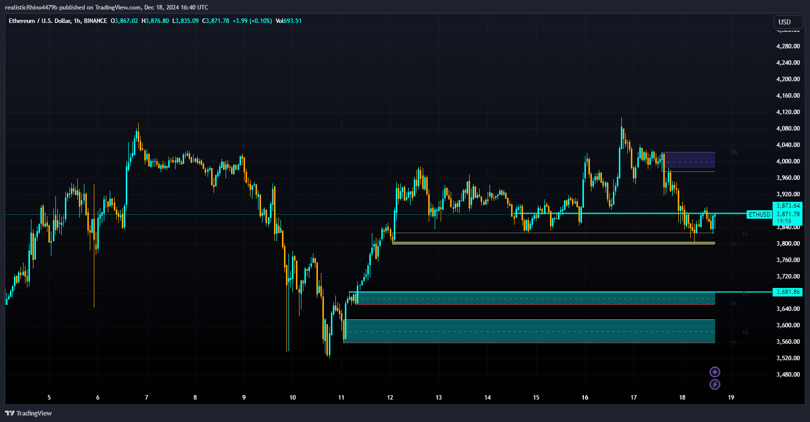 Zielniveau: Das unmittelbare Abwärtsziel wird auf $3680,00 projiziert. Dieses Niveau stellt einen potenziellen Unterstützungsbereich dar, in dem Käufer auftreten könnten.