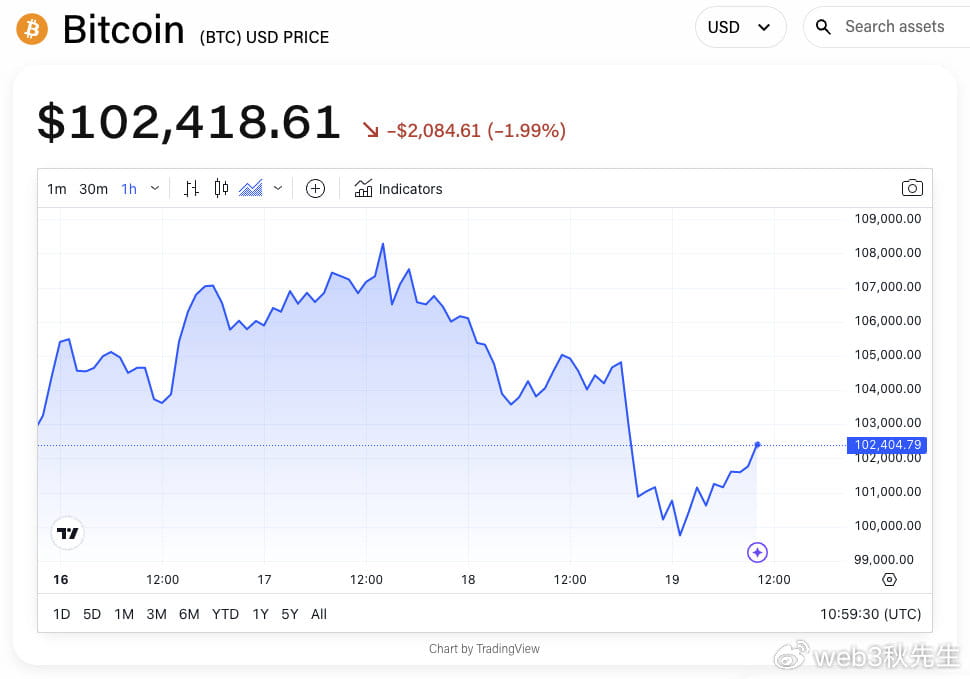 Nicht nur der Aktienmarkt, sondern auch der Kryptowährungsmarkt wurde erheblich beeinflusst. Obwohl der Bitcoin kurzfristig nach der Zinssenkung anstieg, bleibt die Marktsituation weiterhin von Powells Äußerungen betroffen. Bitcoin fiel in kurzer Zeit vor der Rede von 108.000 US-Dollar auf unter 100.000 US-Dollar, und obwohl die anschließende Erholung etwas Linderung brachte, beeinflusste diese Volatilität dennoch erheblich die Stabilität des Marktes. Derzeit stabilisiert sich der Bitcoin-Handelskurs bei etwa 102.419 US-Dollar.