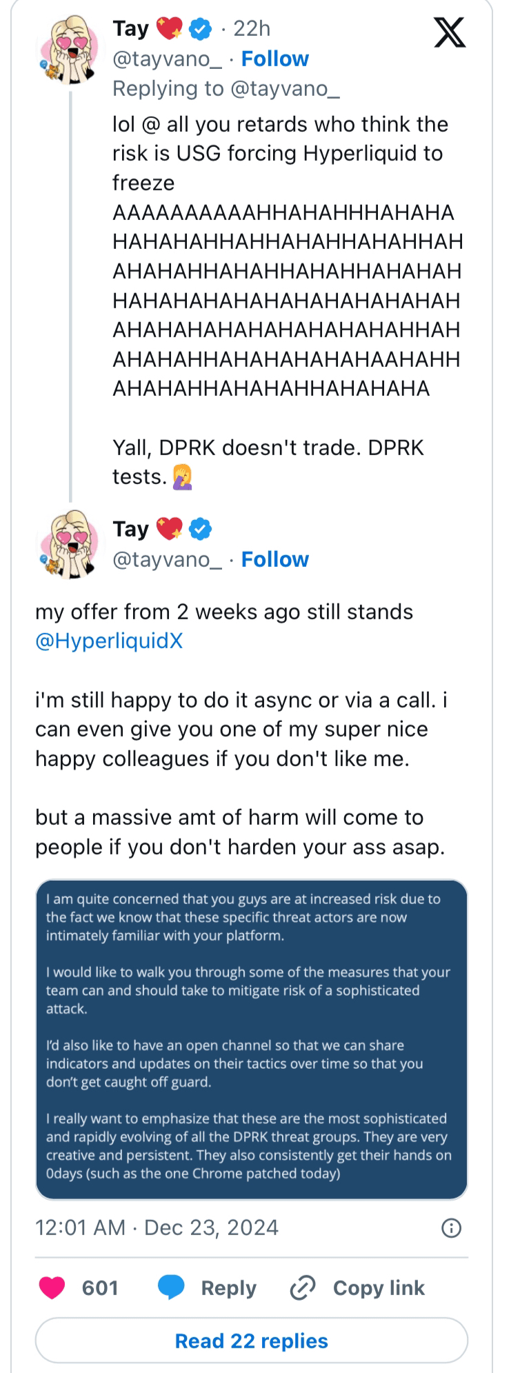 Ein X-Nutzer, der mit Cybersicherheit und den Aktivitäten der Hackergruppen der DVRK (Demokratische Volksrepublik Korea) vertraut ist und sich Tay nennt, merkte an: „DVRK handelt nicht. DVRK testet“, was darauf hindeutet, dass diese Trades (obwohl Verluste) gemacht wurden, damit die Hacker sich mit der Plattform von HyperLiquid vertrautmachen konnten.