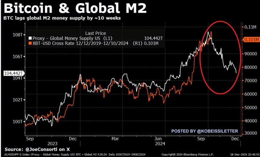 Laut The Kobeissi Letter hat der Preis von Bitcoin historisch gesehen eine 10-wöchige Verzögerung in der Korrelation mit der globalen Geldmenge (Global M2) gezeigt. In den letzten zwei Monaten ist die globale M2 um 4,1 Billionen Dollar gesunken, was die Möglichkeit signalisiert, dass der Preis von Bitcoin weiter fallen könnte, wenn dieser Trend anhält.