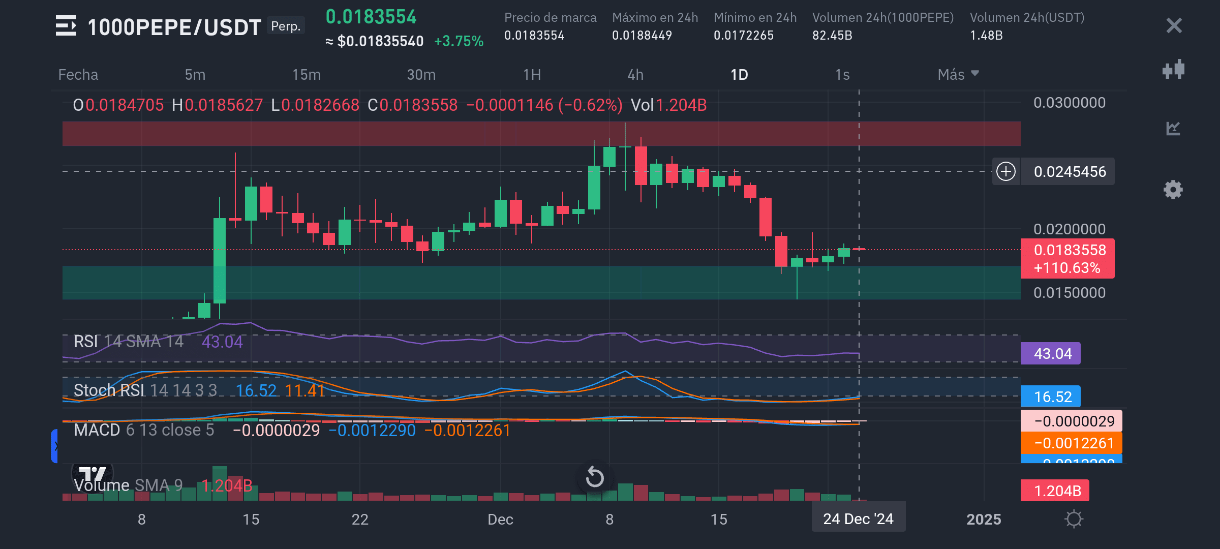 Derzeit zeigt das Paar 1000PEPE/USDT einen seitwärts rückläufigen Trend mit Anzeichen einer Erholung in Richtung höherer Niveaus, wie die neuesten Candlestick-Muster zeigen. Die folgenden Beobachtungen stützen diese Analyse: