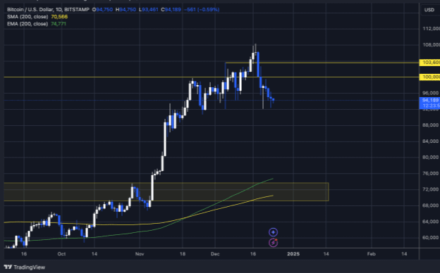 Bitcoin kämpft mit der Marke von 100.000 $, sieht sich anhaltendem Widerstand gegenüber und findet starken Support bei etwa 94.000 $. Kürzlich wurde ein signifikanter Wandel im Kryptomarkt beobachtet. Während Bitcoin mit Verkaufsdruck und Volatilität zu kämpfen hat, haben Altcoins die Führung übernommen, wobei viele Gewinne von über 10% verzeichnen. Diese Veränderung deutet auf einen potenziellen Wandel in den Marktdynamiken hin.