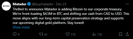 Das kanadische Technologieunternehmen Matador Technologies ist gerade der jüngste Name in der Liste der Unternehmen, die sich für Bitcoin als Teil ihrer Strategie zur Werterhaltung ihrer Vermögenswerte entscheiden.