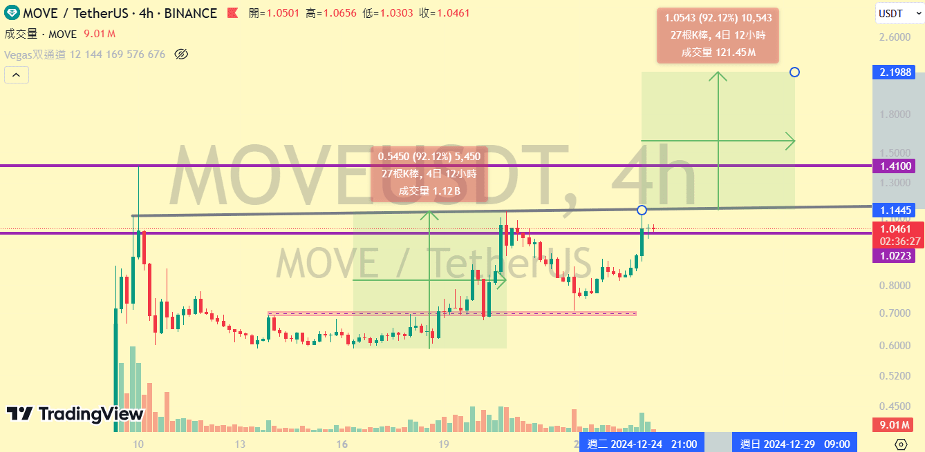 Heute Nachmittag habe ich den Gruppenmitgliedern eine Vorhersage über $MOVE geschickt. Momentan zeigt sich ein Becher-Stiel-Muster. Laut Lehrbuch-Preismodell sollte man vom Becherboden bis zur Becheroberfläche im Verhältnis 1:1 messen. Ich erwarte, dass es in die Nähe von 2.2 geht, aber ob das erreicht wird, hängt vom Schicksal ab, schließlich ist technische Analyse eine linke Seite des Handels, also sollte man versuchen, konservative Handelsstrategien zu verfolgen.