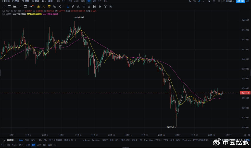 Aktueller Preis: DOGE schwankt derzeit um 0,33, hat sich kürzlich von einem Tiefpunkt von 0,26 allmählich erholt, wird aber weiterhin von wichtigen gleitenden Durchschnitten eingeschränkt.