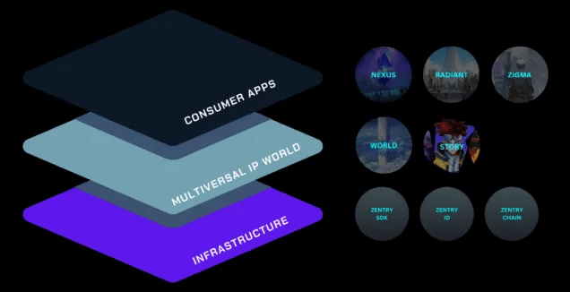 Der Metagame Stack besteht aus drei Schichten: Consumer Applications, Open IP Universe und Metagame Protocol. Dieses vertikal konzipierte Full-Stack-Ökosystem ist auf Robustheit, Skalierbarkeit und Anpassungsfähigkeit ausgelegt, um die nahtlose Integration verschiedener Spielerlebnisse, sozialer Interaktionen und wirtschaftlicher Aktivitäten zu ermöglichen und gleichzeitig eine dynamische, vernetzte Umgebung zu bilden. Benutzer interagieren hauptsächlich mit den Consumer Applications, über die sie mit dem Open IP Universe interagieren können. Das Zentry-Ökosystem verfügt derzeit über eine robuste Schicht von Consumer Applications, darunter die bereits erwähnten Nexus, Radiant, Zigman und Azul.