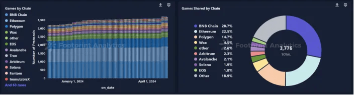 Die aktuelle GameFi-Landschaft umfasst über 3.500 Blockchain-Spiele. Der Löwenanteil dieser Blockchain-Spiele befindet sich in der BNB-Kette, Ethereum und Polygon und macht zusammen fast 60 % des Gesamtanteils aus. Von diesen Blockchain-Spielen sind etwa 700 aktiv, wobei die BNB-Kette etwa 26,7 %, Polygon 12,2 % und Ethereum 20,6 % ausmacht.
