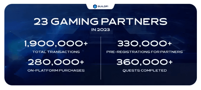 Während der GuildFi-Ära fungierte das Projekt in erster Linie als Gaming-Gilde und GameFi-Dienstleister und richtete sich sowohl an Spieler als auch an Spieleentwickler. Durch das Erfüllen von Gildenaufgaben sammelten die Spieler Punkte, die sie gegen Belohnungen und Stipendien eintauschen konnten, und erhielten frühzeitigen Zugang zu Partnerprojekten von GuildFi. Für Spieleentwickler baute GuildFi eine große und engagierte Spielerbasis auf und diente als wichtiger Marktplatz für Gaming-Assets, der Spielewerbung, den Verkauf von Assets und unschätzbares Spielerfeedback ermöglichte. GuildFi gab in seinem jüngsten Post auf Medium „GuildFi 2023 Recap and Gearing Up for 2024“[4] (gepostet im Januar 2024) bekannt: „Im Rahmen der Partnerschaften im Jahr 2023 hat GuildFi insgesamt 330.000 Partner-Vorregistrierungen für die oben genannten Spieletitel erzielt, wobei die Plattform 1.900.000 Transaktionen und 280.000 Käufe ansammelte.“ Im Laufe seiner Geschäftstätigkeit ist GuildFi Partnerschaften mit namhaften Projekten wie Memeland, Ronin, Xai, Sipher und Pixelmon eingegangen.