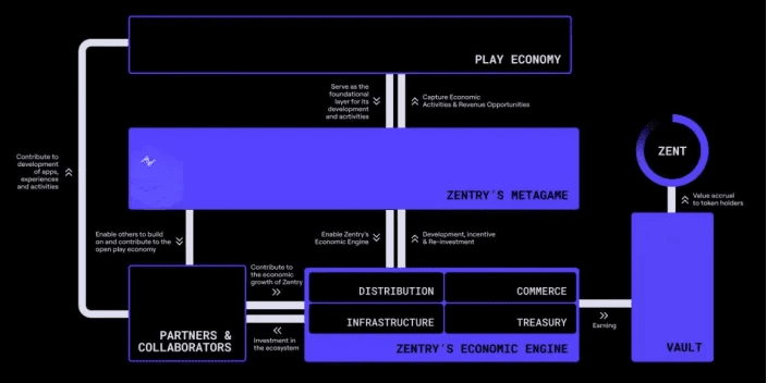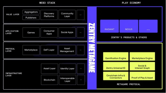 Auf Mikroebene verkörpert Zentry einen ganzheitlichen Anbieter von Gaming-Infrastruktur und Ökosystem-Services. Das Projektteam erklärte in einem Post auf Medium[5]: „Enter Zentry, die Metagame-Ebene, die das MMORPG-Erlebnis ins echte Leben bringt. Es ist ‚das Spiel aller Spiele‘.“ Zentry ist Vorreiter eines neuen Paradigmas – der Play Economy, in der In-Game-Erfolge oder -Assets zwischen Spielen übertragen werden können, wodurch ihr Nutzen über die Grenzen des digitalen Bereichs hinaus erweitert wird. Die Metagame-Ebene besteht aus drei vertikal integrierten Kernen:
