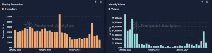 Dennoch wird deutlich, dass der GameFi-Sektor im aktuellen Marktzyklus hinsichtlich seines Transaktionsvolumens noch keine vollständige Erholung erlebt hat. Obwohl das Volumen im Vergleich zu 2023 gestiegen ist, bleibt es deutlich von den im Jahr 2022 beobachteten Werten entfernt, wobei das monatliche Transaktionsvolumen derzeit bei etwa 1.200 Millionen US-Dollar liegt. Darüber hinaus bleibt die Anzahl der monatlichen Transaktionen im Jahr 2024 deutlich hinter der von 2023 zurück. Die derzeitige monatliche Transaktionszahl beträgt 3,13 Millionen, im krassen Gegensatz zu den rund 7 Millionen, die im gesamten Jahr 2023 verzeichnet wurden.