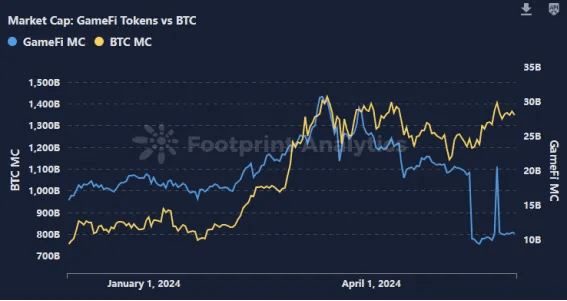 Laut der von Footprint[6] bereitgestellten Datenanalyse beträgt die aktuelle Marktkapitalisierung von GameFi-Tokens etwa 27,6 Milliarden US-Dollar. In den letzten drei Monaten ging die deutliche Aufwärtsdynamik von Bitcoin mit einem bescheidenen Anstieg der Marktkapitalisierung von GameFi-Tokens einher. Dieses Wachstum blieb jedoch hinter dem Ausmaß des Aufstiegs von Bitcoin zurück.