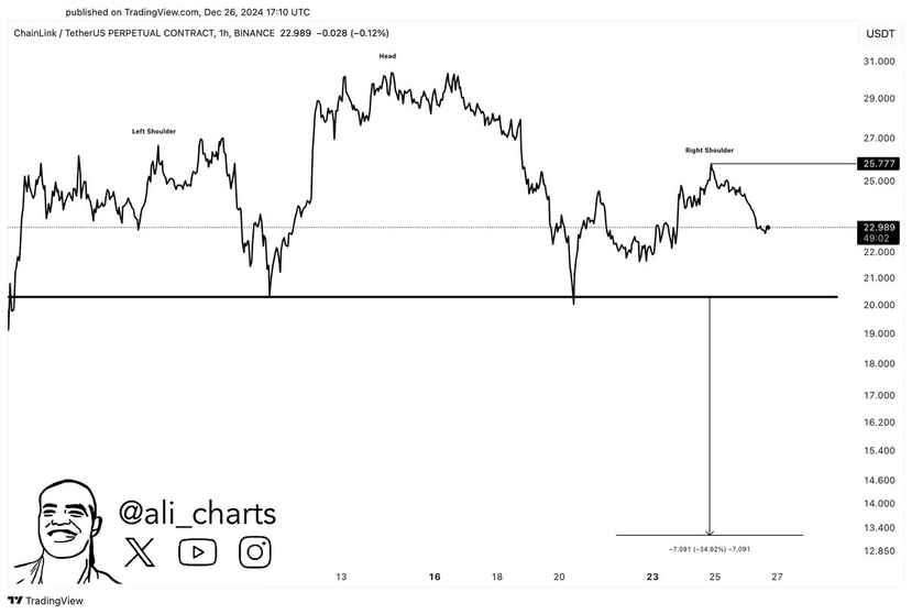 Top-Analyst Ali Martinez lieferte eine detaillierte technische Analyse von X und hob ein kritisches Muster hervor, das den nächsten Schritt von LINK bestimmen könnte. Laut Martinez bildet Chainlink ein Kopf-Schulter-Muster – eine Struktur, die oft mit rückläufigen Umkehrungen in Verbindung gebracht wird. Wenn sich dieses Muster bestätigt, könnte $LINK einen erheblichen Rückgang erleiden und in den kommenden Wochen möglicherweise auf bis zu 14 $ fallen.