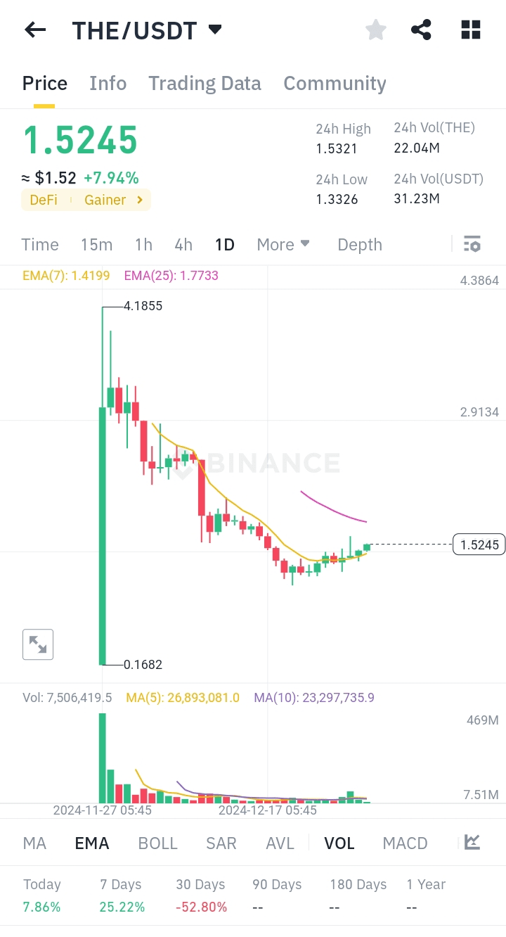Am 29. Dezember 2024 wird THE bei 1,52 $ gehandelt, was einem Anstieg von 10,95 % im Vergleich zum vorherigen Schlusskurs entspricht.
