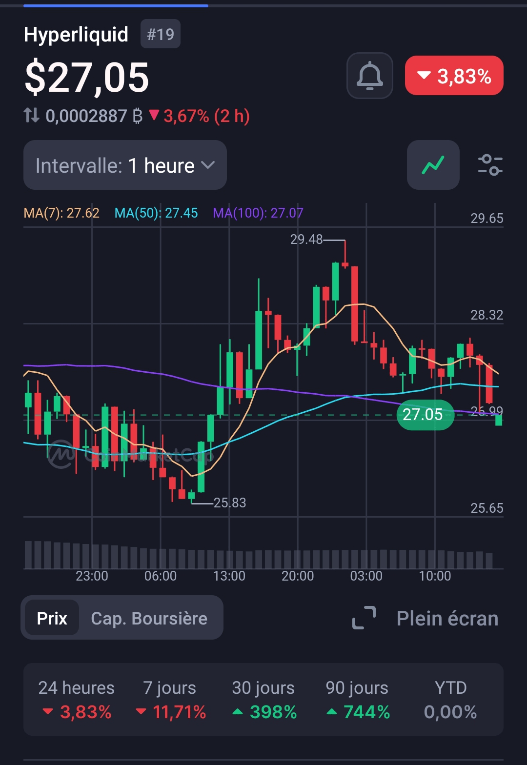 ⚠️Achtung, es muss im Moment noch sofort geschrieben werden und wie in vielen Ökosystemen, die gerade gestartet sind, sind das Hyper-EVM-Netzwerk noch nicht gestartet und die Validierer, aus denen das Testnetz besteht, arbeiten noch nicht im Mainnet Hyperliquid One wird von einigen Infrastrukturanbietern zentralisiert, die die Genehmigung erhalten haben. Es gibt keine genaue Erklärung zum genauen mathematischen Nutzen des Tokens, dieses Token, das den Wert des Hyperliquid-Angebots auf 27 Milliarden Dollar schätzt, was dieses Projekt zur 25. Kryptowährung mit dem höchsten Wert im gesamten Ökosystem macht. Heute hat es noch keine genaue mathematische Spezifität, wir wissen noch nicht genau, wofür es verwendet wird, aber die Community hat das starke Gefühl, dass all das Vertrauen und bis jetzt, als wir nicht wussten, was Hyperliquid tun will, mussten wir ihnen blind folgen und alle, die es getan haben, haben es nicht bereut. Es gibt buchstäblich Leute, die Millionen und Abermillionen von Dollar dafür bekommen haben, dass sie Hyperliquid ein paar Monate lang verwendet haben. Natürlich möchte man ihnen folgen, aber wieder einmal wird ein Skalenerfolg von ihren Netzwerkerfolgen und nicht vom Protokoll abhängen und zum Abschluss kommt es zum richtigen Zeitpunkt am richtigen Ort auf einem Kryptomarkt, der Bitcoin übertrifft, der neue Rekorde brechen wird, und auf den Altcoins, die langsam aufwachen. Es ist eine perfekte Konstellation der Planeten. Erfahrungsgemäß gibt es immer einen Moment, an dem eine Kurve endet, nicht so ruhig, und es gibt immer Korrekturen, und das gilt auch für die langfristige Entwicklung eines Projekts. Meiner Meinung nach herrscht heute eine Euphorie, die gerechtfertigt sein kann, und angesichts der Einnahmen, die das Protokoll erzielt, könnte es sogar gerechtfertigt sein, dass der Token weiter steigt. Aber wie man in der Finanzwelt sagt: Man darf nicht nach den Messern greifen, die fallen, wenn alle Preise einbrechen. Außerdem muss man es vermeiden, in eine Kryptowährung einzusteigen, die sich Tag für Tag vervielfacht, wenn man keine Erfahrung hat, wenn man keine Perspektive hat, weil man sonst riskiert, eine schlechte Position einzunehmen.