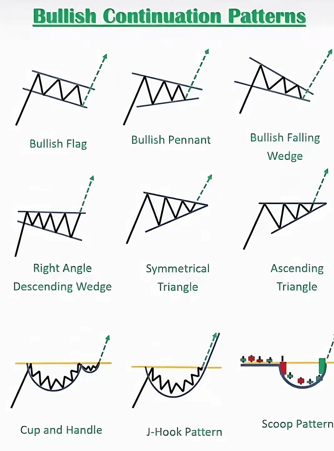 Diese Muster deuten darauf hin, dass der Aufwärtstrend nach der Konsolidierung fortgesetzt wird. Zu den wichtigsten bullischen Mustern gehören: