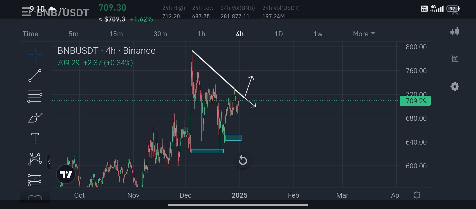 Das Handels Paar BNB/USDT liegt derzeit bei $709.29 und spiegelt einen moderaten Gewinn von +1.62% in den letzten 24 Stunden wider. Lassen Sie uns tiefer in das 4-Stunden-Diagramm eintauchen, um die aktuelle Struktur des Marktes und potenzielle zukĂŒnftige Bewegungen zu analysieren.