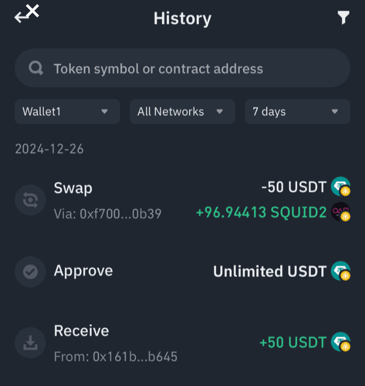 Wenn Sie diese Schritte befolgen, sollten Sie in der Lage sein, die Aktivität nachzuvollziehen und herauszufinden, was mit Ihren 50 USDT und den Squid Game 2-Token passiert ist.