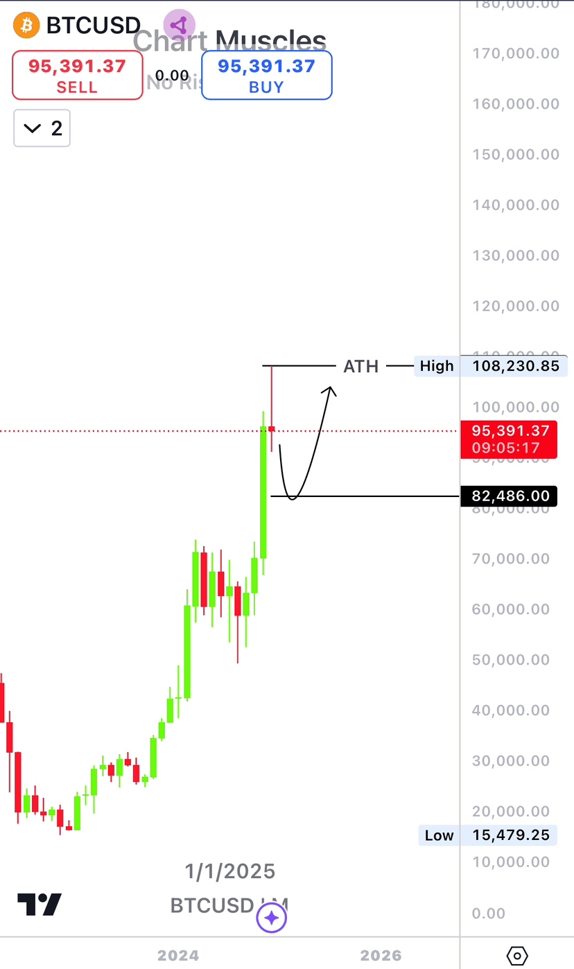 Hier ist meine Analyse für den kommenden Monat (Januar). Wie wir alle im Monat November nach dem Sieg von Präsident Trump, der die Krypto-Unterstützung voll und ganz unterstützt, im Gegensatz zur Biden-Administration, miterlebt haben, gab es einen $BTC großen Schub. Im Dezember begann der Preis zu Beginn des Monats zu steigen, wodurch wir unser aktuelles Allzeithoch erreichten, und am Ende begann er zu fallen, was uns wahrscheinlich eine schwache monatliche bärische Kerze bis heute gibt.
