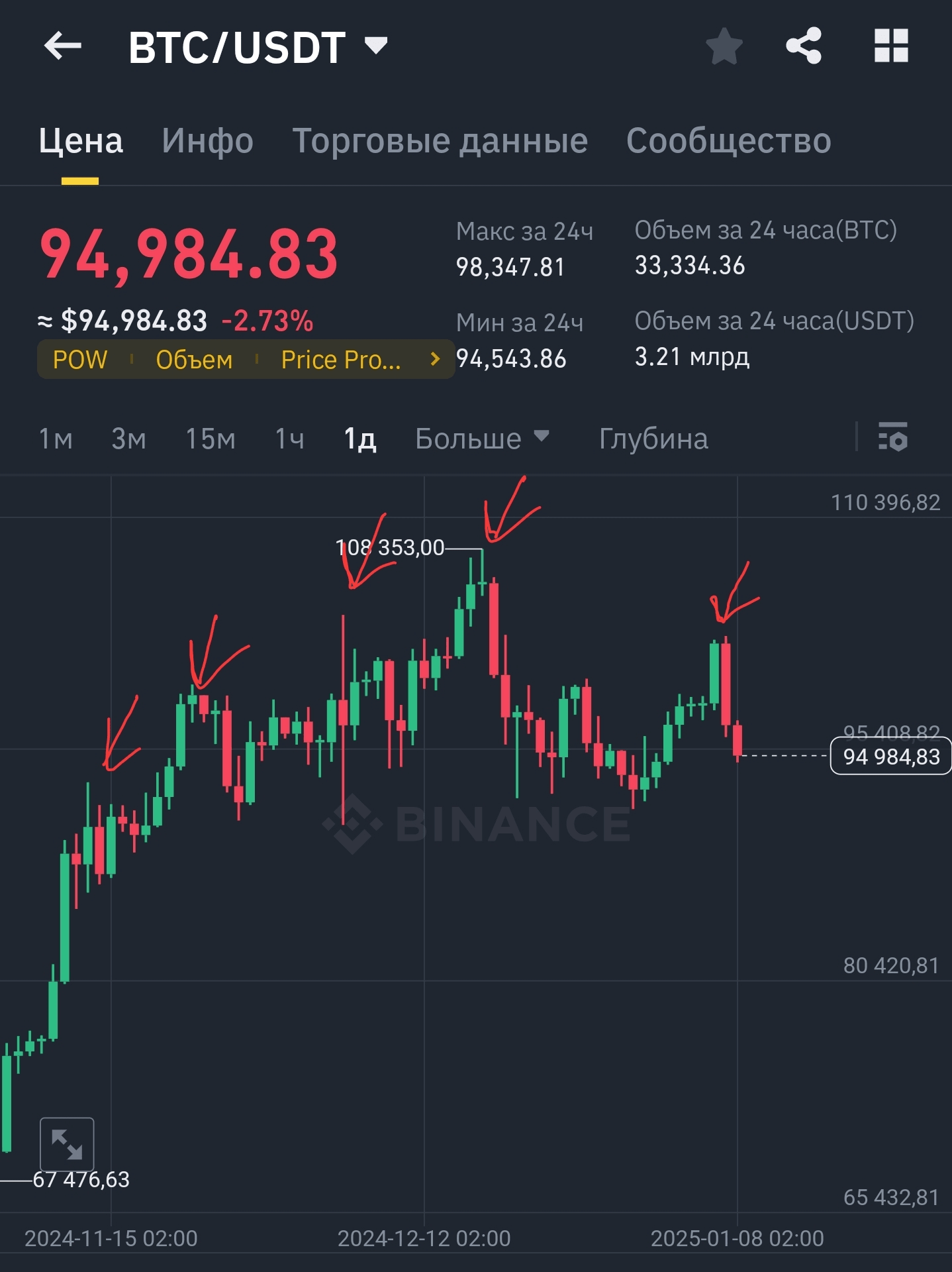 $BTC-Diagramm. Ich verwende es nur, weil es den Markt kontrolliert und keine plötzlichen Spitzen verursacht. Auf dem Foto unten habe ich Ihnen die Spitzen gezeigt, die die Münze bildet, und wir sollten auf sie warten. Nach starkem Wachstum gibt es immer eine Korrektur.