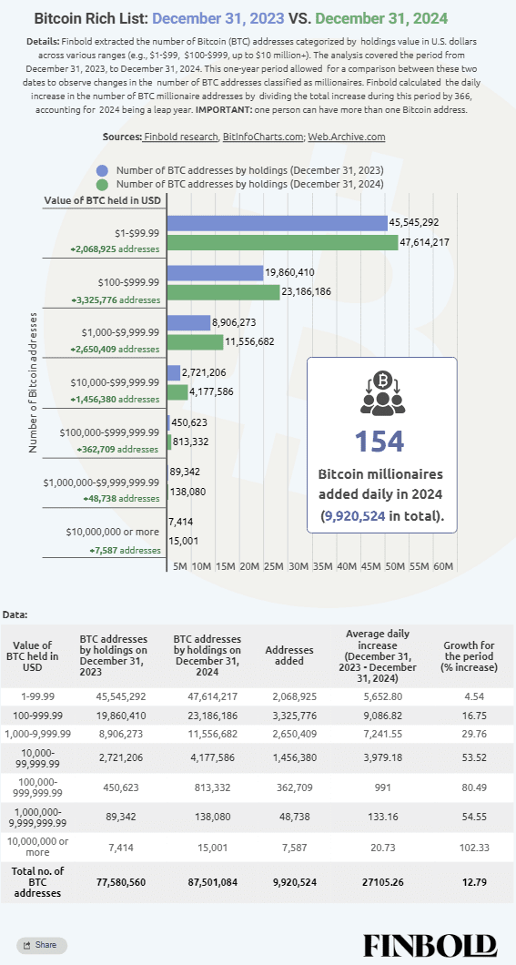 Laut einer Analyse von Finbold wurden im Jahr 2024 durchschnittlich 154 neue Bitcoin-Adressen im Wert von über 1 Million Dollar täglich erstellt. Dies summierte sich für das Jahr auf einen Gesamtzuwachs von 56,325 solchen Adressen. Ende 2023 gab es knapp 97,000 Adressen, während es Ende 2024 über 153,000 waren – ein Anstieg von 58,21%.