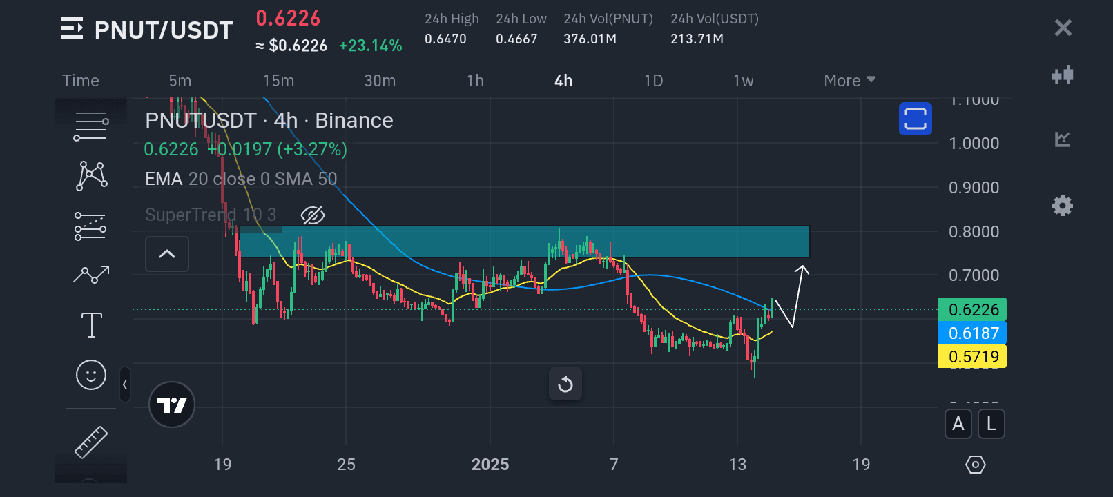 Der Preis könnte zwischen $0.62 und $0.65 konsolidieren und einen engen Bereich schaffen, bevor er seinen nächsten entscheidenden Schritt macht.