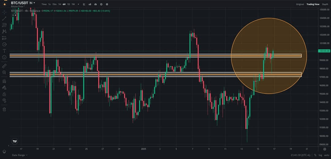 - Die untere Unterstützung, die zur Widerstandszone wurde (~$97.000 - $99.000), war ein bedeutendes Niveau, an dem sich der Preis zuvor konsolidiert hat und Ablehnungen erfahren hat.