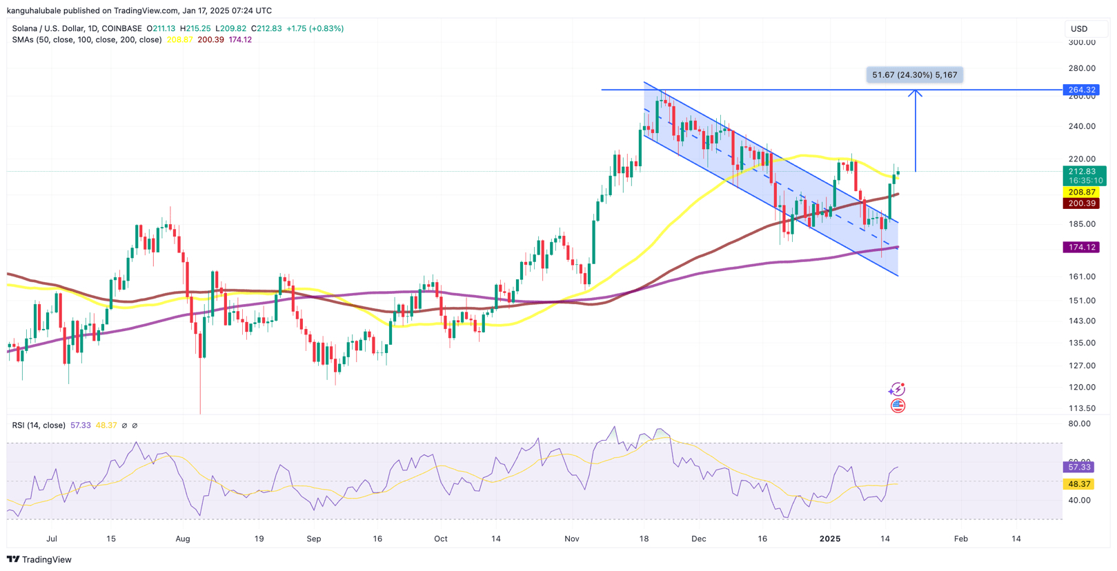 „Mit dem Boden in Sicht, $SOL sieht es danach aus, dass es weiter nach oben geht. Der Druck sollte in den kommenden Tagen auf 220 $, 230 $ und 240 $ steigen.“
