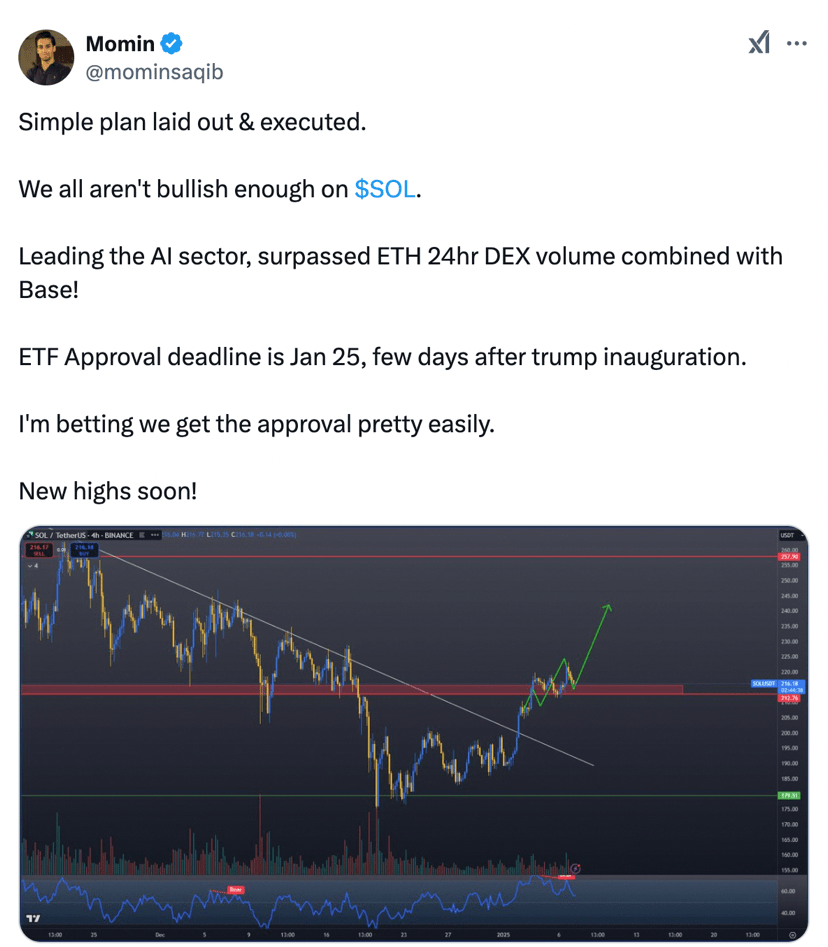 Der pseudonyme Trader Momin fügte hinzu, dass die Genehmigung eines Spot-SOL-ETFs in den nächsten Tagen den Preis auf 'neue Höchststände' treiben könnte.