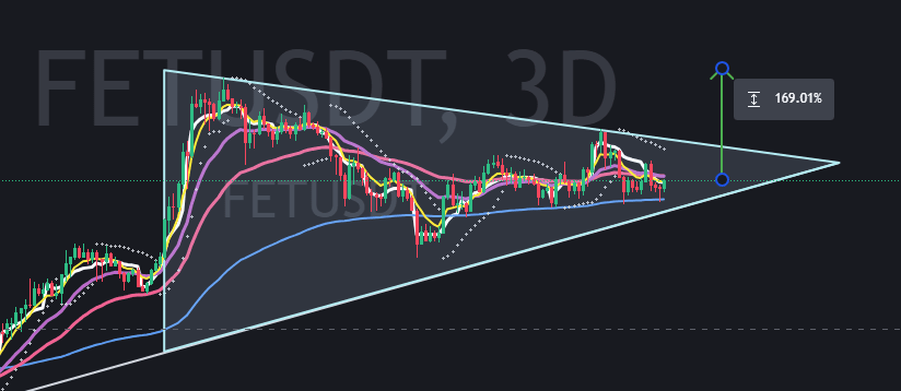 Leichtes Dreiecksmuster. Krypto, die mit dem KI-Sektor tendenziell stark wächst. Der Preis stimmt (30D). Das erste Ziel liegt bei etwa +10 %, das nach Durchbrechen des Widerstands im Dreieck etwa 170 % erreichen könnte, wenn der historische Höchststand erreicht wird.