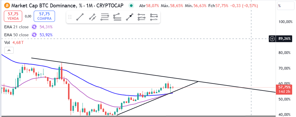 Die Dominanz von #BTC bleibt bei rund 57 %. Daher ist anhand der Grafik ersichtlich, dass das gebildete aufsteigende Dreieck respektiert wurde. Wenn es so weitergeht, dürfte die lang erwartete Altseason 2025 Mitte des Jahres stattfinden.