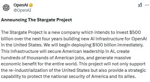 Durch dieses Projekt plant das Unternehmen, KI-gesteuerte Rechenzentren in den Vereinigten Staaten einzurichten und dabei 100.000 neue amerikanische Arbeitsplätze zu schaffen. Trump gab in einer Pressekonferenz bekannt, dass OpenAI, SoftBank und Oracle die Investmentgruppe leiten, die sofort 100 Milliarden Dollar in das Projekt investieren wird.