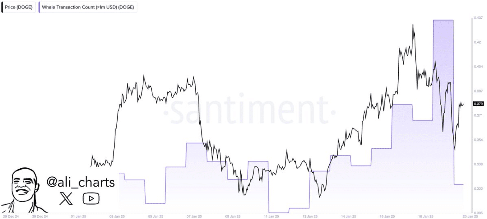 Die großen Transaktionen im Dogecoin-Netzwerk sind gestiegen. Analyst Ali hob hervor, dass in den letzten 24 Stunden 588 Transaktionen im Wert von über 1 Million Dollar verzeichnet wurden.