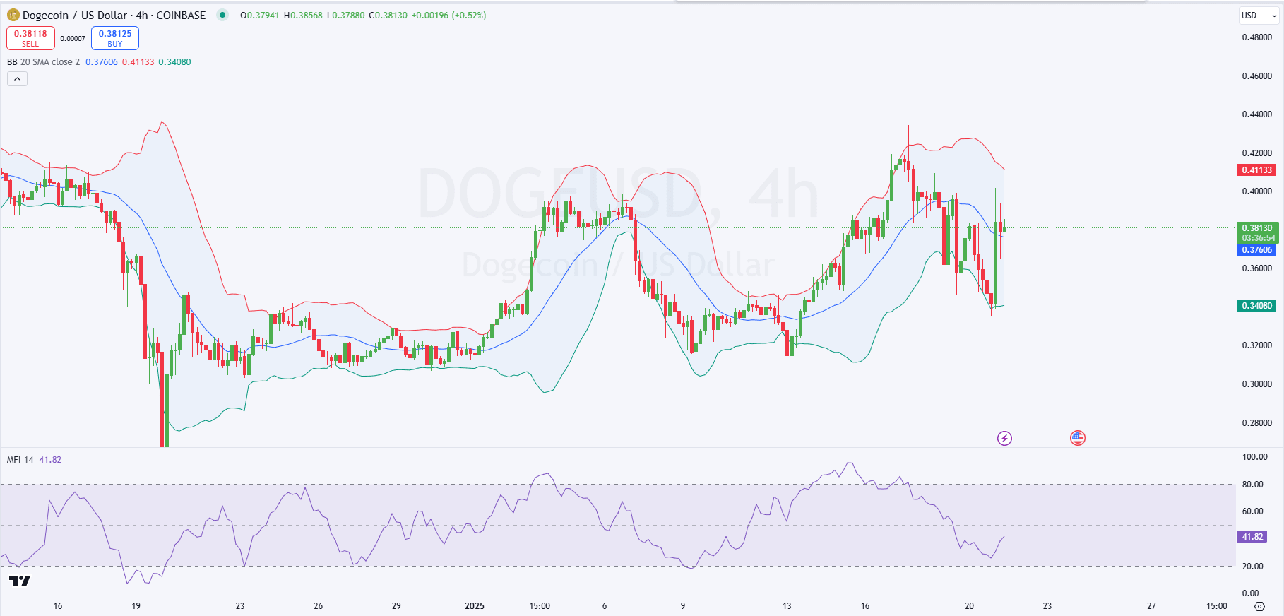 Das 4-Stunden-DOGE/USD-Diagramm zeigt, dass der Preis nahe der unteren Bollinger-Band bei $0,3754 gehandelt wird, was auf überverkaufte Bedingungen hindeutet.