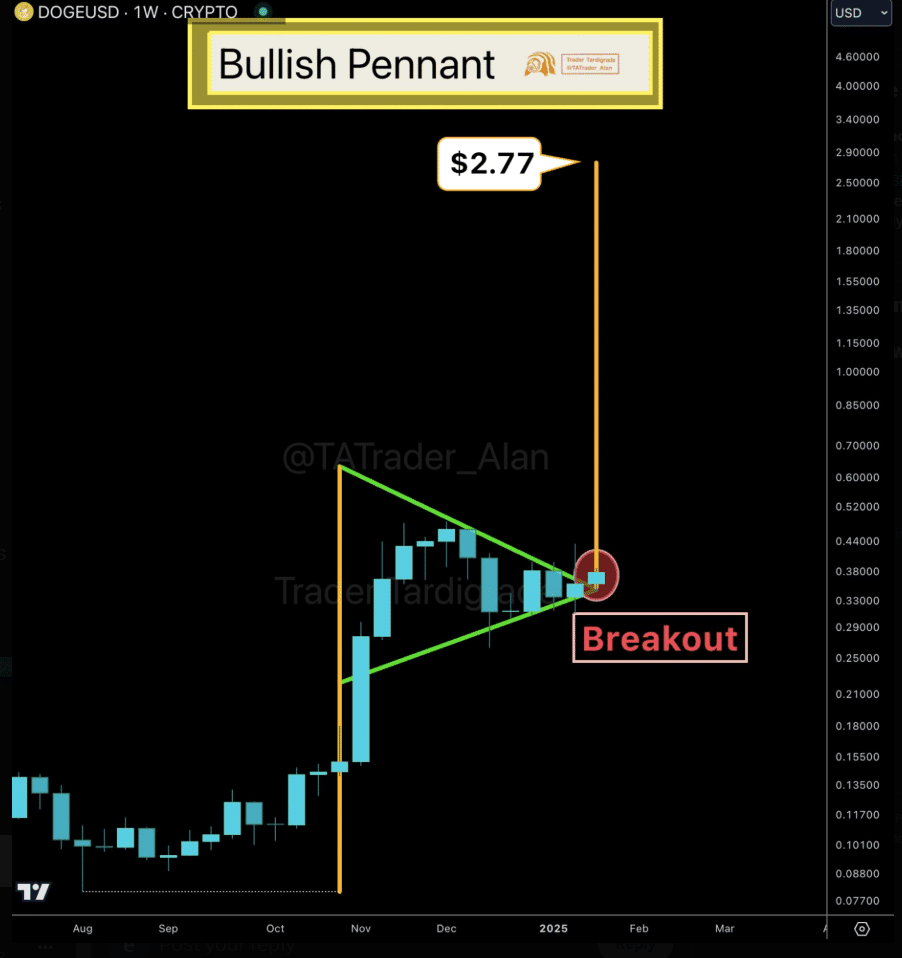 Im wöchentlichen Diagramm hat Dogecoin ein bullisches Flaggenmuster durchbrochen, was die Fortsetzung seines Aufwärtstrends signalisiert. Analyst Trader Tardigrade identifizierte einen Zielpreis von $2,77 für dieses Muster, was auf erhebliches Wachstumspotenzial von den aktuellen Niveaus hinweist.