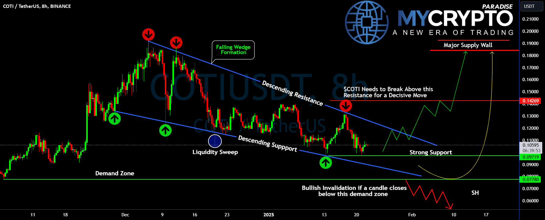💎COTI stößt bei 0,142 USD auf einen starken Widerstand, der perfekt mit der oberen Grenze des absteigenden Keils übereinstimmt. Ein sauberer Durchbruch und ein Schluss über diesem Niveau im 8-Stunden-Zeitraum könnten eine Rallye in Richtung der großen Angebotsmauer von 0,18–0,19 USD auslösen, wo die Verkäufer wahrscheinlich einsteigen werden.