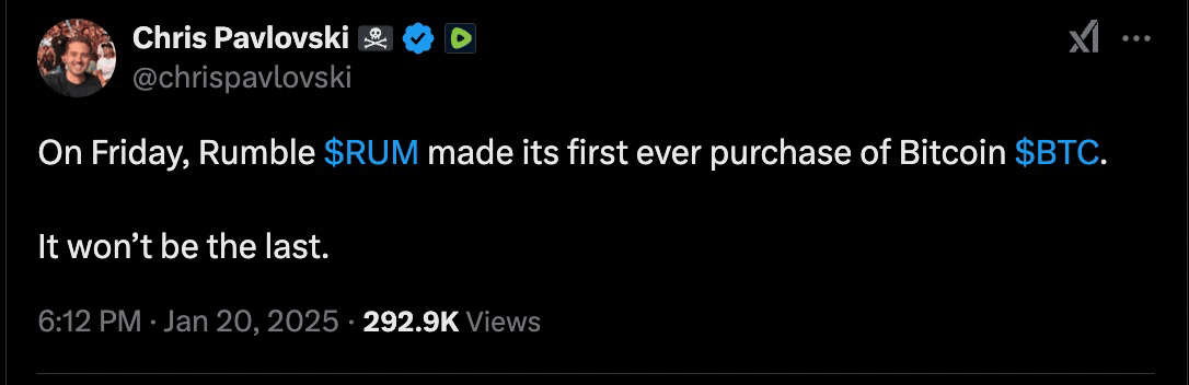Am 20. Januar schockierte Rumble Inc. ($RUM) die Finanzwelt, indem es seinen ersten Bitcoin-Kauf ankündigte, rechtzeitig zur historischen Rückkehr von Donald Trump als 47. Präsident der Vereinigten Staaten. Die Video-Sharing-Plattform gab bekannt, dass dies erst der Anfang ihrer Bitcoin-Reise ist und damit den Weg für einen neuen Unternehmens-Trend ebnet: #BuyBitcoin, lass deine Aktien steigen.