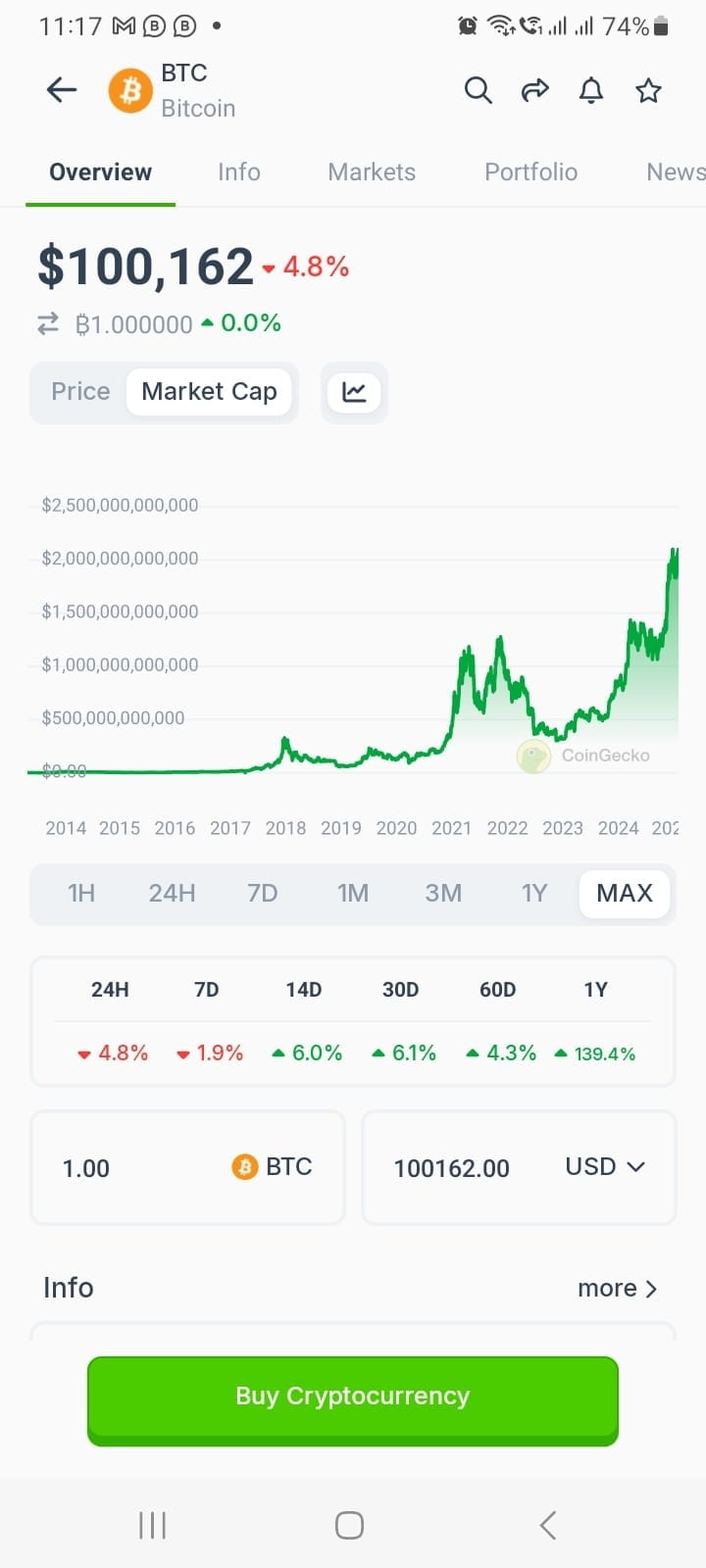 Nun ja, vielleicht irgendwann, obwohl es unwahrscheinlich ist. Aber langfristig könnte Bitcoin als erster eine Marktkapitalisierung von 3, 4, 5, … 10 Billionen USD erreichen. Mal sehen, wie sich das entwickelt. 😊
