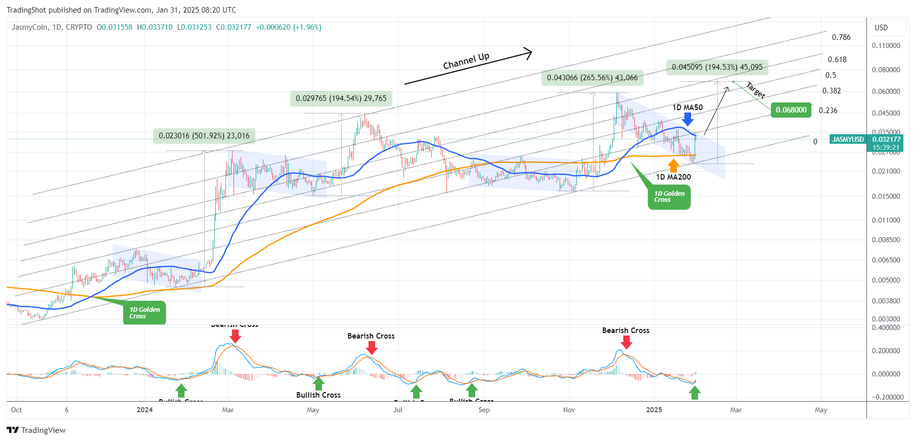 Mit dem 1D MACD, der gerade einen bullischen Kreuzungspunkt unter der 0,0-Marke abgeschlossen hat, erwarten wir, dass Jasmy ausbricht und mindestens einen weiteren Anstieg von +194,50% von seinem Tiefpunkt aus anstrebt. Ziel 0,06800.