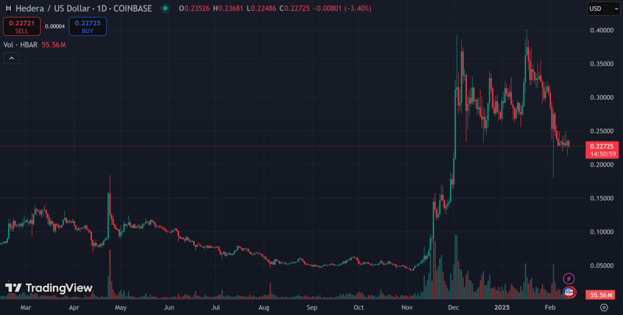 Hedera Hashgraph ist eine Kryptowährung, die im Jahr 2025 Millionäre machen könnte. HBAR hat einen lobenswerten Anstieg erlebt, mit einem Anstieg von 182,24 % im letzten Jahr. Dieses Wachstum wird durch das gestiegene Interesse von Institutionen und strategischen Allianzen, wie der Nairobi Securities Exchange, die Teil des Hedera Council wird, um die Tokenisierung zu untersuchen, vorangetrieben.