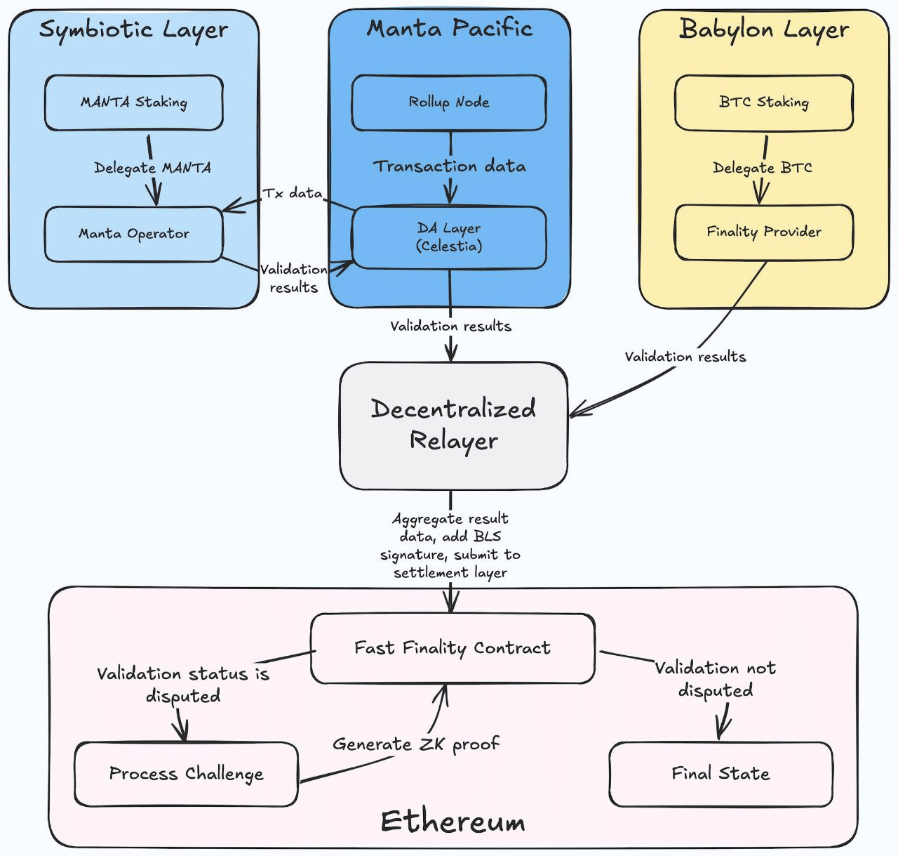 Sobald die Validierungsdaten vom MANTA Restaking (Symbiotic) und BTC Staking (Babylon) gesammelt sind, vervollständigt der Finalitätsmechanismus von Ethereum den Prozess in drei Schritten: