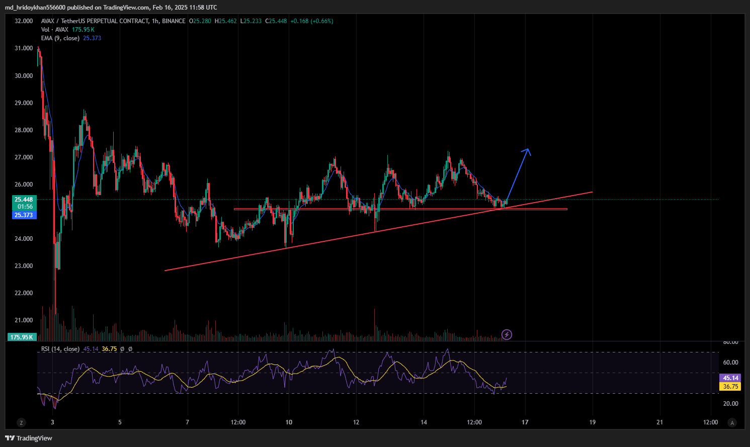 Dieses 1-stündige AVAX/USDT Perpetual-Contract-Diagramm zeigt eine starke Trendlinie (rot), die als Unterstützung fungiert. Nach dem erneuten Testen dieser Unterstützungslinie versucht Avax, einen guten Aufprall zurückzunehmen. Hoffentlich nimmt es von dieser Trendlinie an Fahrt auf.