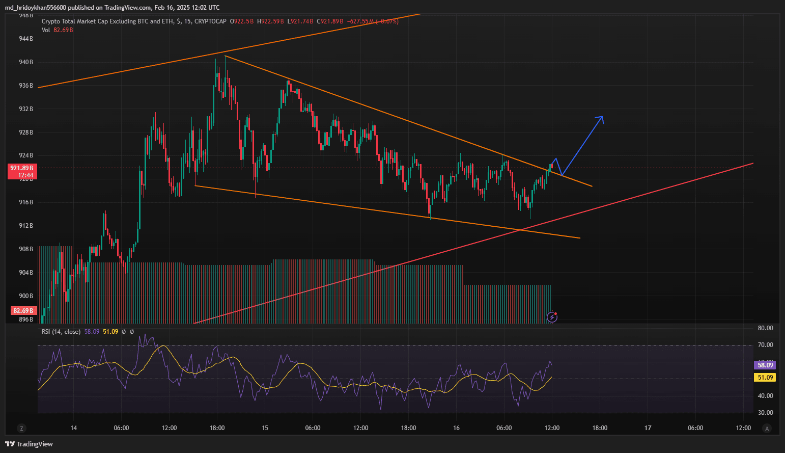 Dieses 15-minütige Diagramm der gesamten Kryptowährungsmarktkapitalisierung (ohne BTC & ETH) zeigt ein fallendes Keilmuster (orange), eine bullische Umkehrformation. Der Preis bricht über den Widerstand aus und stimmt mit der blauen Pfeilprojektion für die Aufwärtsbewegung überein. Die rote Trendlinie fungiert als zusätzliche Unterstützung. Der RSI bei 58,09 deutet auf wachsenden bullischen Schwung hin. Ein bestätigter Ausbruch könnte zu weiteren Gewinnen führen,
