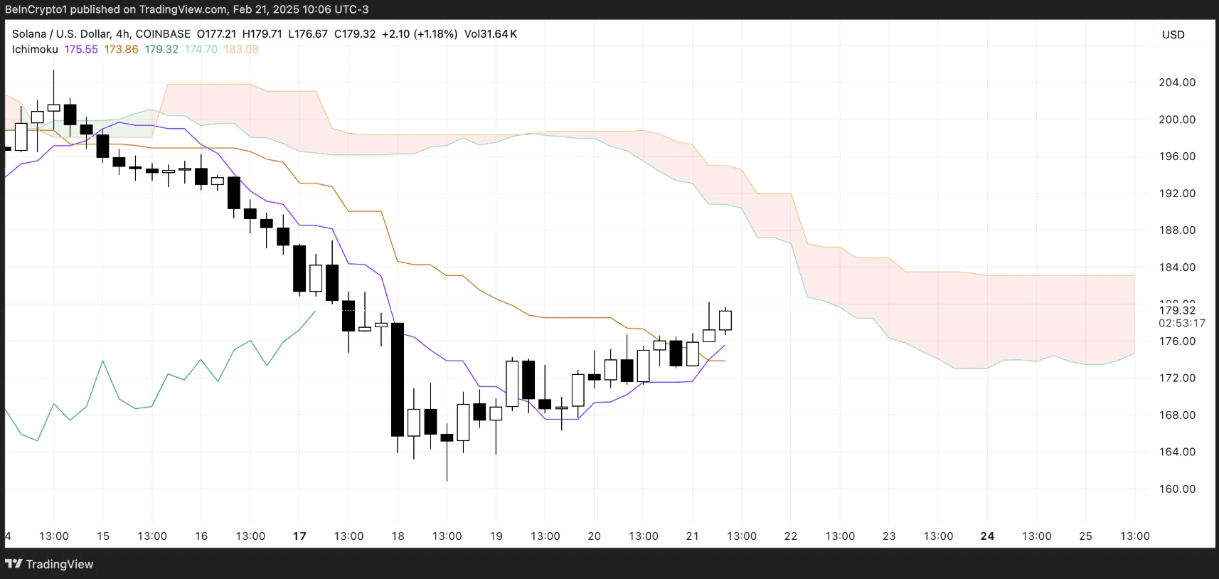 Der Ichimoku Cloud Index von SOL/USDT im 4-Stunden-Chart | Quelle: TradingView