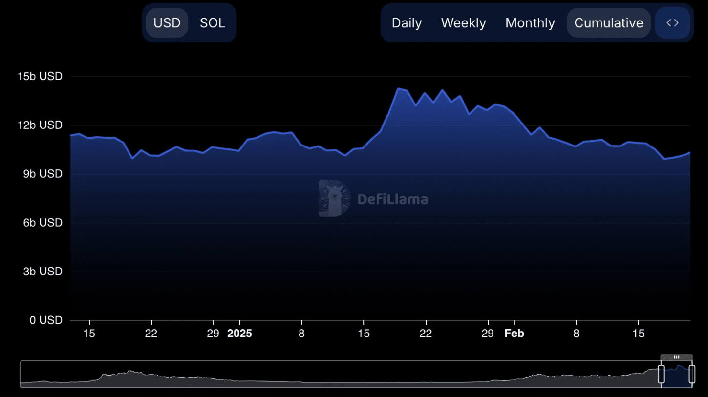 Der Gesamtwert, der in Solana (TVL) gebunden ist, liegt derzeit bei 10,3 Milliarden USD, nachdem er sich von einem Tief von 9,90 Milliarden USD am 17. Februar erholt hat – dem niedrigsten Stand seit dem 14. November 2024. Trotz dieser Erholung ist der TVL um fast 30 % von 14,2 Milliarden USD am 18. Januar gefallen, was auf ein nachlassendes Vertrauen der Investoren hinweist.