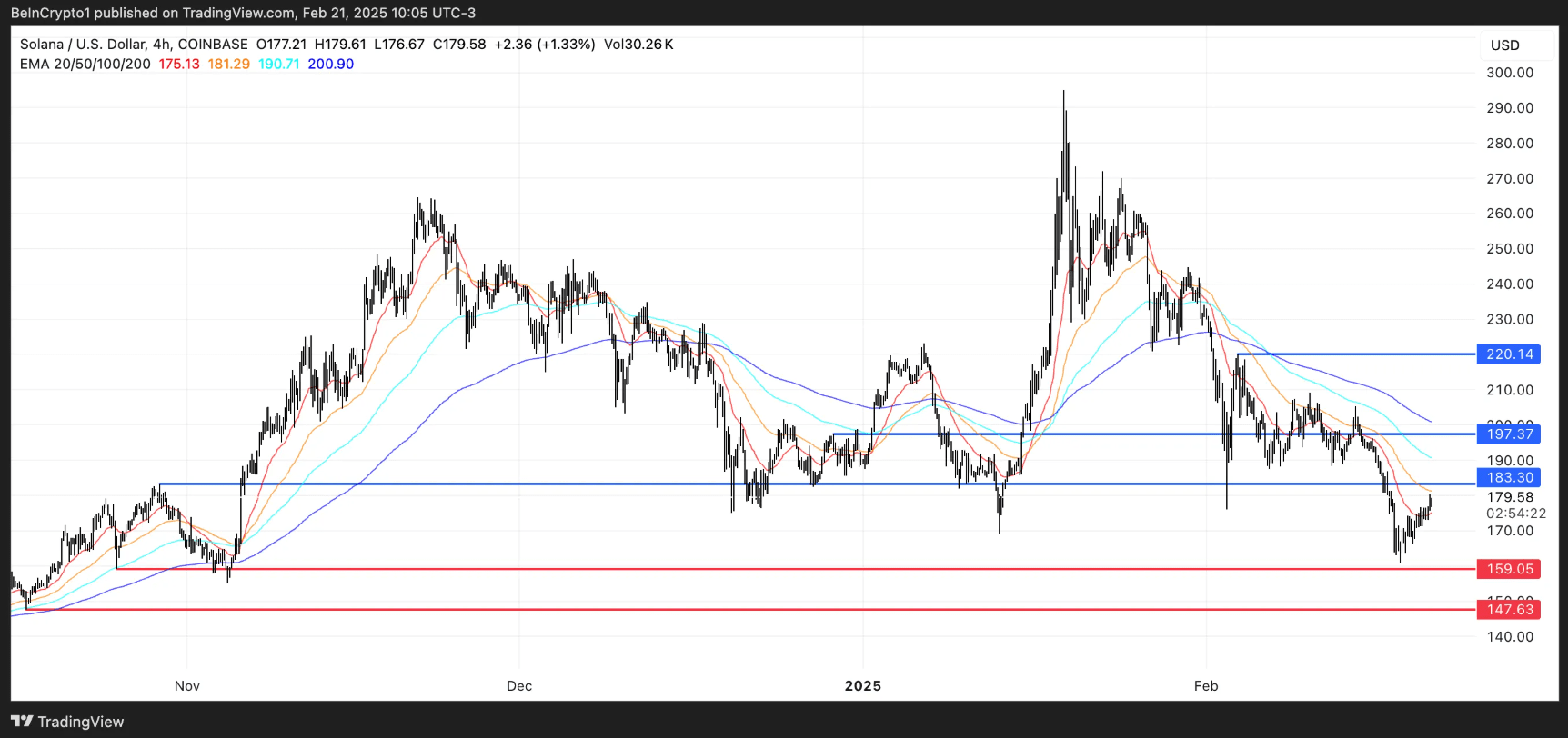 Wenn SOL in der Lage ist, den aktuellen Abwärtstrend vollständig umzukehren, könnte es den ersten Widerstand bei 183 $ testen. Wenn der Ausbruch erfolgreich ist, würde dies einen stärkeren Aufwärtstrend signalisieren, der den Preis auf den nächsten Widerstand bei 197 $ treiben könnte.