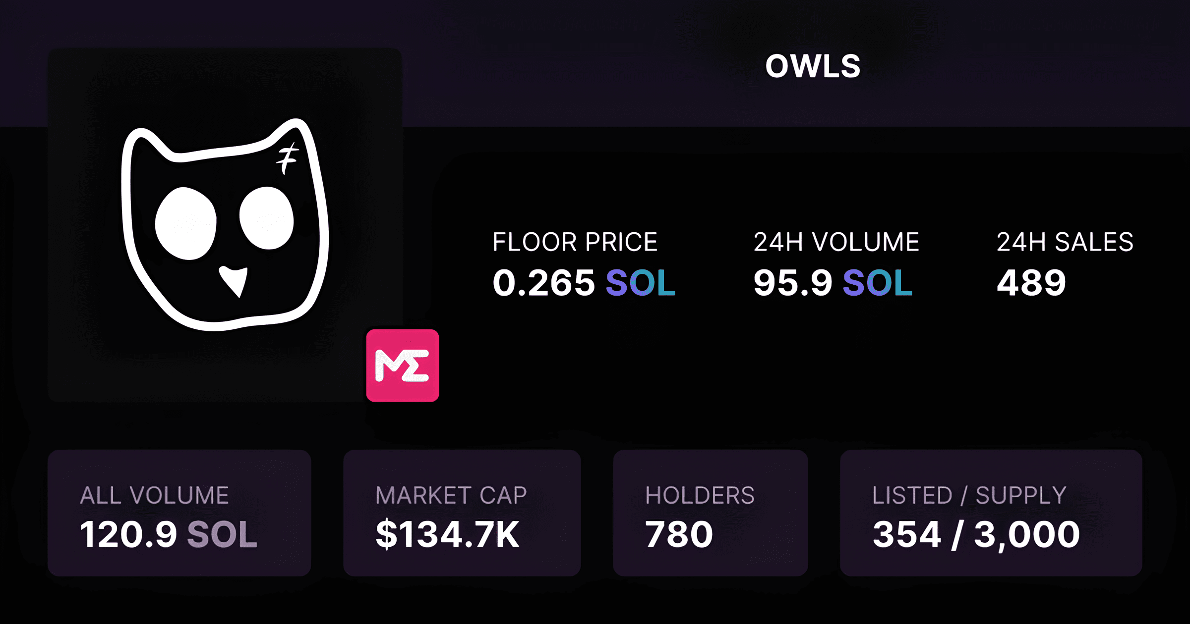 OWLS hat einen beeindruckenden Anstieg des Bodenpreises von 96,0 % erlebt, der jetzt bei 0,3 SOL liegt, mit einem Höchstangebot von 0,251 SOL. Mit einem Volumen von 111,2 SOL und 485 aufgelisteten Artikeln von 3.000 zeigt dieser Anstieg von 12,4 % in der 24-Stunden-Aktivität das explosive Wachstum und die Anziehungskraft dieser Kollektion.