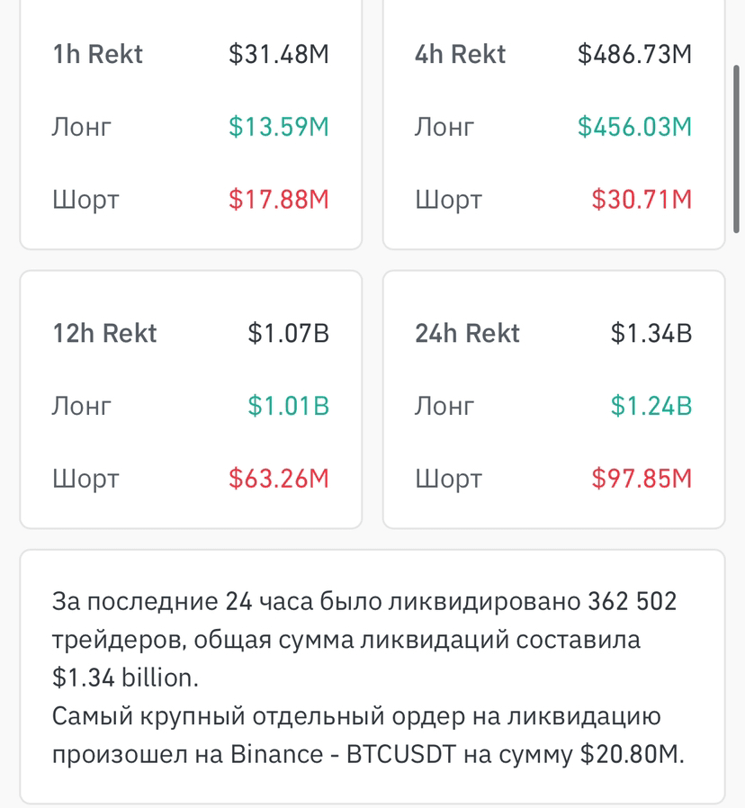 In den letzten 24 Stunden kam es zu insgesamt 1,34 Milliarden Liquidationen.